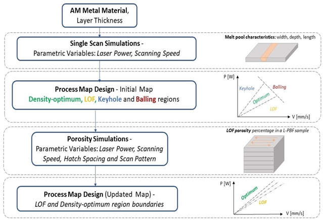 作者提出并验证了一种用于设计金属合金激光粉末床熔融(L-PBF)打印性图的建模方法。该L-PBF工艺的有限元建模方法包含两部分:单次激光扫描分析和小样品孔隙率分析。在单次激光扫描分析中,根据基于几何形状的准则,对不同工艺参数组合下的预测熔池进行表征。采用并评估了文献中已有的关于熔池缺陷(LOF)、匙孔和球化孔隙的判据。表征结果用于设计所研究金属合金的初始可打印性图,图中描绘了最佳密度区域以及熔池缺陷、匙孔和球化区域。对L-PBF零件进行初始优化。在小样品孔隙率分析中,利用初始预测的最佳密度参数模拟小样品的L-PBF制造过程,以预测其整体孔隙率。此步骤旨在研究最佳密度和熔池缺陷参数在构建孔隙率最小的零件方面的能力。研究结果用于更新初始工艺图并设计新的边界。该方法旨在减少设计打印性图所需的实验测试次数,从而准确预测导致激光粉末床熔融(L-PBF)缺陷和近乎全密度零件形成的参数。此外,该方法还可用于关联工艺参数与最终的微观结构以及所研究金属材料的力学性能。因此,可以降低增材制造(AM)金属零件力学性能的差异性,从而在工艺参数、材料微观结构和力学性能之间建立更一致的关系。该建模方法已基于文献中关于316L不锈钢和Ti-6Al-4V增材制造金属合金的现有实验数据进行了验证。总体而言,预测结果与实验表征结果之间的相关性非常令人满意,验证了所提出的方法。