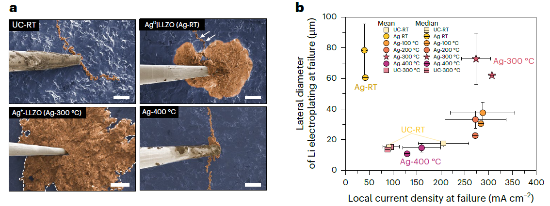 研究团队利用原位电化学显微探针技术(图3),在扫描电镜中实时研究银离子表面掺杂对LLZO锂沉积行为的影响,并通过控制探针与样品表面的接触压力,来模拟极端机械应力条件。结果显示,经300 ℃退火处理的银离子掺杂LLZO即使在3 GPa高应力下,仍可实现更大面积、更加均匀稳定的锂沉积,其沉积失效面积显著扩大,临界电流密度明显提升(图4)。