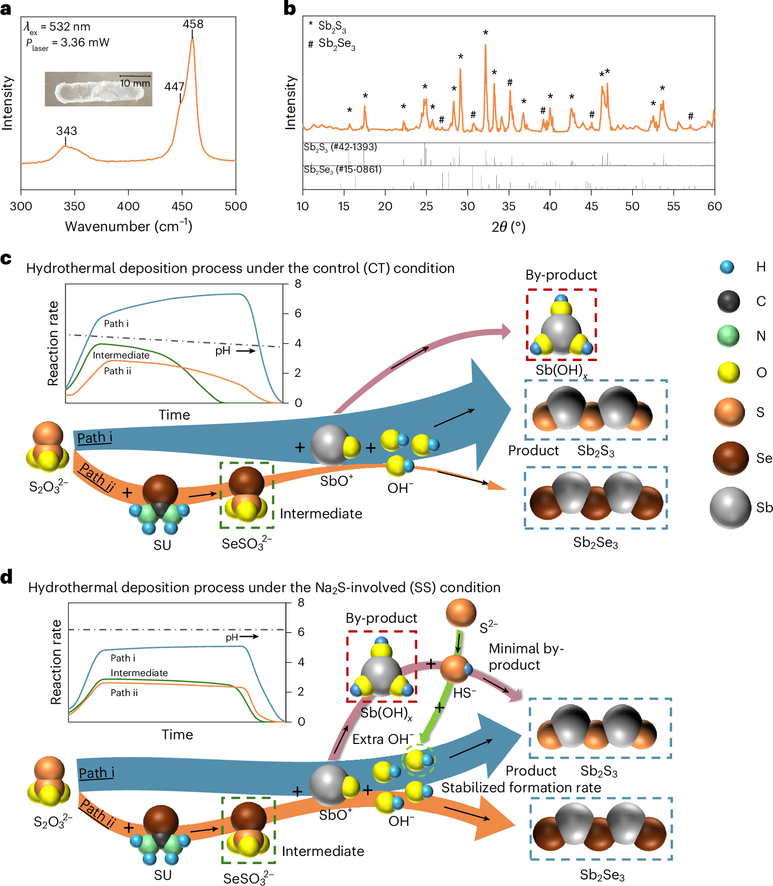 图1:水热反应原理。a,在STS与SU水热反应后,对反应溶液进行真空干燥所得残留物的拉曼光谱。位于343、447和458 cm-1的特征峰分别对应于SeSO32-的Se–S伸缩振动、S2O32-的S–S伸缩振动以及SO42-的v2模式(对称弯曲振动)。插图:样品外观。b,两步水热反应后所得沉淀物的X射线衍射(XRD)图谱。反应悬浊液经离心收集沉淀,并进行后续退火处理。衍射峰可分别索引为Sb2S3(PDF#42-1393)和Sb2Se3(PDF#15-0861)。c, d, 控制条件(CT,c)和引入Na2S的SS条件(d)下水热合成主要反应路径的示意图。蓝色、橙色和粉紫色箭头分别表示三条随时间演化的主要反应路径,即路径 i:Sb2S3的生成、路径 ii:Sb2Se3的生成以及副产物生成路径。箭头宽度表示反应速率。中间体、产物和副产物分别以绿色、浅蓝色和红色方框标示。插图为对应的反应速率与pH随时间变化曲线,显示SS条件下的反应速率明显比CT条件更为平稳。