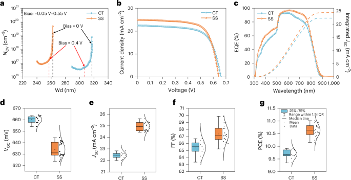 图5:载流子浓度与光电性能。a, 由 C–V 测量得到的Mott–Schottky曲线,用于表征Sb2(S,Se)3体相中的有效载流子浓度,其在纵轴上以NCV表示。横轴中的Wd表示在所施加偏压下的耗尽区宽度。b、c, CT和SS器件的J–V曲线(b)及外量子效率(EQE)曲线(c)。d–g, CT(n = 9)和 SS(n = 22)器件的开路电压(Voc)、短路电流密度(Jsc)、填充因子(FF)以及光电转换效率(PCE)的统计分布。d–g 中箱线图的最小值、最大值、中位值、箱体边界、须线范围及分位数定义一致,具体说明见g图中的图例。