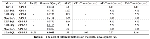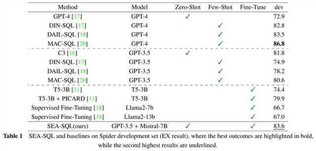 在Spider和BIRD数据集上的实验结果显示,SEA-SQL在基于GPT-3.5的条件下取得了优于其他方法的表现,并且其性能可以与基于GPT-4的结果相媲美。此外,SEA-SQL相较于其他方法具有显著的低开销优势。