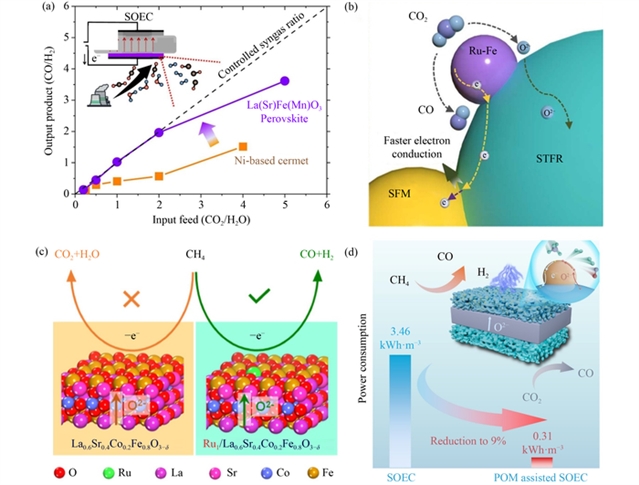在CO2转化路径方面,研究总结了两类关键技术:一类是无附加步骤的直接转化,包括CO2直接还原制CO、CO2与H2O共电解制合成气、甲烷干重整(DRM)制合成气、CO2氢化制甲烷及甲烷/乙烷氧化制乙烯。其中,共电解通过调控CO2与H2O流量比可精确控制合成气比例,是当前研究最深入的方向;此外,近年来利用SOECs实现CO2氧化甲烷/乙烷生产乙烯已成为研究热点。另一类是耦合共电解的多过程转化,包括共电解制甲烷、制甲醇及制燃料。尽管后一类技术理论上可生产高附加值化学品,但受限于SOECs的高成本与工业示范不足,目前仍处于理论或实验室阶段。