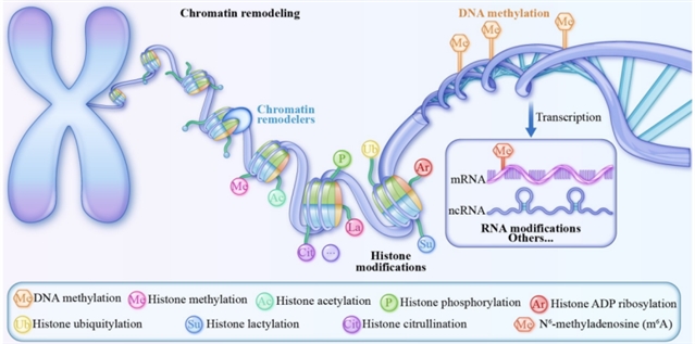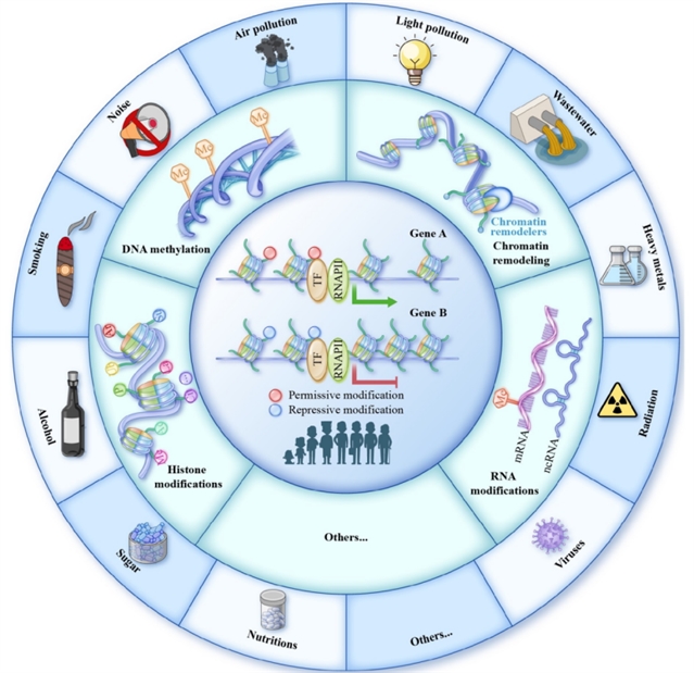 表观遗传学是研究在不改变DNA序列的情况下,基因功能发生可遗传变化的学科。自1942年Waddington提出“表观遗传型”概念以来,该领域逐渐发展成为连接基因型与表型的重要桥梁。表观遗传修饰主要包括DNA甲基化、组蛋白修饰、染色质重塑和RNA修饰等多种形式(图1),它们共同参与基因表达的精细调控,影响细胞分化、个体发育及疾病发生。近年来,越来越多的证据表明,表观遗传修饰对环境因素非常敏感,外界暴露如空气污染、化学物质、饮食和生活方式等,均可通过改变表观遗传状态进而影响人体健康。环境因素与表观遗传之间的交互作用,已成为解释许多复杂疾病发生机制的关键。然而,目前对于多因素共同作用下的表观遗传调控网络仍认识有限,亟需系统梳理其在疾病预防与治疗中的潜在价值。