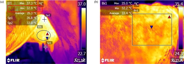 图1 使用FLIR Tool+软件计算平均乳房皮肤表面温度 (a) 与胁部皮肤温度 (b)。