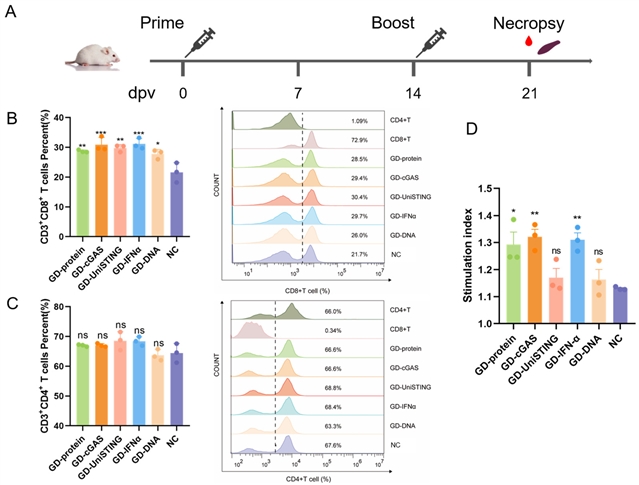 (2) 佐剂通过激活cGAS-STING通路和JAK-STAT信号,显著提升CD8+ T细胞比例及T细胞增殖能力,且能在免疫后3天快速提供完全保护,解决了传统疫苗免疫空白期问题。