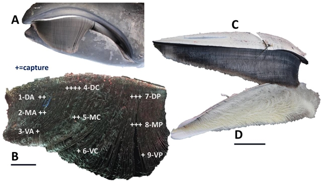研究了鲸须对塑料降解渗出的化学残留物的捕获能力,结果证实四种受试鲸类的鲸须均能捕获残留物,但是他们在捕获或粘附塑料残留物方面表现没有显著差异。