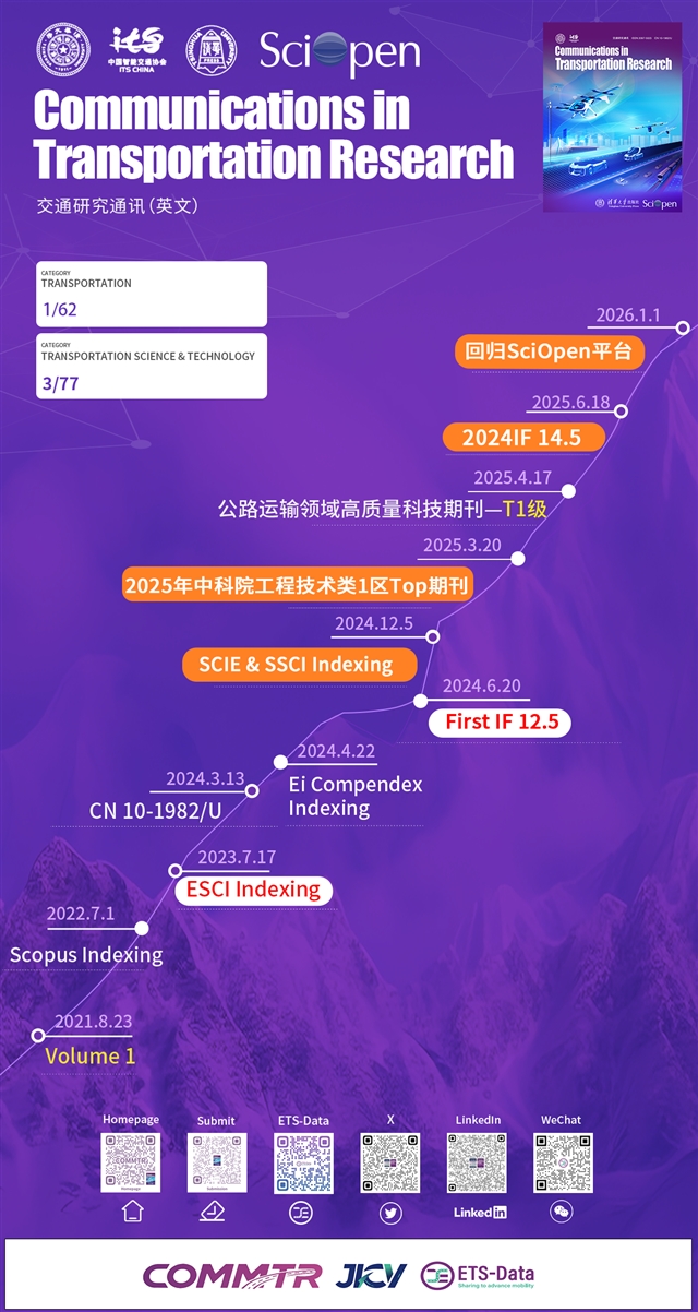 《交通研究通讯(英文)》创刊于2021年,主编为欧洲科学院院士、清华大学曲小波教授。期刊聚焦新兴交通系统领域,致力于发表高质量原创研究与综述,搭建国内外交通学术界交流与合作的桥梁。在短短数年发展中,COMMTR屡获重要突破:已被SCIE、SSCI、Scopus、Ei Compendex、CSCD等十余个国内外重要数据库收录;2025年6月公布的影响因子达到14.5,在JCR“交通”学科62种期刊中位列第一;连续两年获评“中国最具国际影响力学术期刊”,并先后入选“中国科技期刊卓越行动计划英文梯队期刊项目”及“北京市高水平国际科技期刊建设支持项目”。2025年,该刊入选《中国科学院文献情报中心期刊分区表》工程技术大类一区,跻身Top期刊,并在公路运输领域高质量期刊分级中获评T1级。