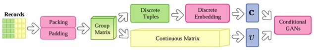为了捕捉组的局部分布,本文提出使用组打包与组填充的方式将记录转化成组矩阵。给定组矩阵后,文章使用离散数据作为条件,连续数据作为值,训练一个条件生成对抗网络,以控制生成多少组/记录以及如何生成它们,进而满足组级和表级的相似性。此外,文章还优化了离散嵌入的训练方式,以更好地处理离散值。