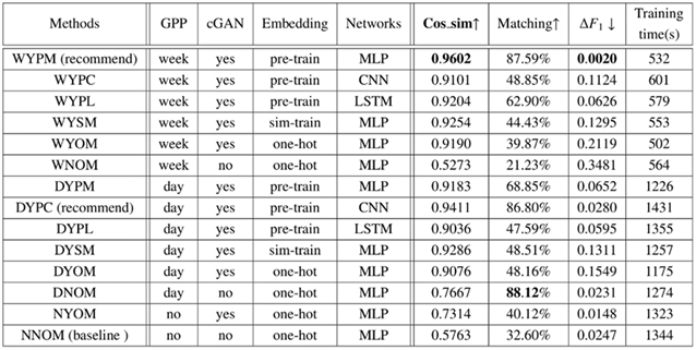 使用本文的合成数据训练的模型与使用真实数据集训练的模型具有相似的F1分数、高匹配率和高余弦相似度,这远远优于使用其他方法生成的表格训练的模型。
