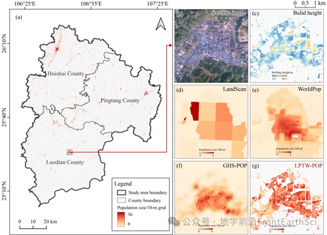 Fig.6 LPTW-POP in the study area and the comparison of population distribution in the partial area from different datasets. (a) LPTW-POP in the study area; (b) Satellite image in the partial area; (c) Build height grid in the partial area; (d) LandScan in the partial area; (e) WorldPop in the partial area; (f) GHS-POP in the partial area; (g) LPTW-POP in the partial area.