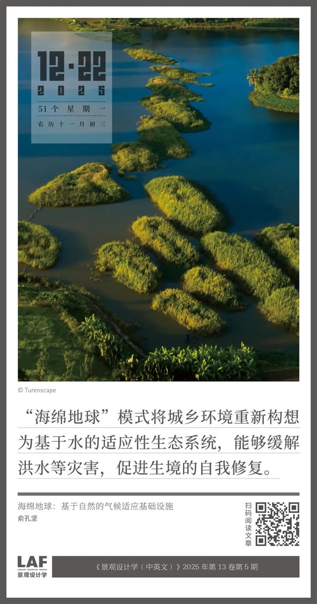 随着气候变化影响的加剧及相关灾害的频繁发生,以减少碳排放为核心的气候减缓策略和依赖钢筋水泥等灰色基础设施的适应策略弊端日益显现。本文介绍了“海绵地球”的气候韧性范式——一种以景观为基础、遵循水文逻辑并基于自然的气候适应与生态修复框架。文章综合了数十年的研究成果与全球600余个实践案例,系统反思了灰色基础设施的局限性,指出其在历史、文化与物质层面与生态原则的背离。相较之下,“海绵地球”模式围绕三大核心策略展开——源头留住雨水、过程减缓水流、末端与水为友——从而将城乡环境重新构想为基于水的适应性生态系统,具备缓解洪水、干旱灾害及应对海平面上升和城市热岛效应等问题的能力,并能够促进生境的自我修复。通过来自中国、泰国及其他国家和地区的案例,文章展示了如何运用模块化设计、本土材料与基于GIS的精细化技术建构深层次的生态基础设施。最后,本文提出一个面向地球的设计框架,将科学知识、文化遗产与景观设计相结合,以恢复地球的再生能力,并在气候危机背景下提升地球和城乡环境的长期韧性。