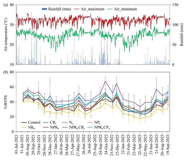 图1 (a) 研究期间观测点的气温和总降水量,以及 (b) 整个观测期内不同处理的土壤充水孔隙度 (%WFPS)。