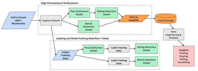作者在本文中介绍了一个开源的DIY边缘计算框架——公共生活传感器套件(PLSK),利用计算机视觉(CV)技术实现公共空间的持续实时数据收集,实现行为自动化分析。系统由GoPro摄像头和NVIDIA Jetson Orin Nano边缘计算设备组成,分别负责视频输入和数据处理。该系统摒弃了依赖原始图像像素的传统方法,提出了一种创新的姿态估计增强动作识别算法。该算法首先使用Ultralytics YOLOv8-pose模型对视频流进行实时人体姿态估计,提取并绘制关键点骨骼图。随后,将此姿态增强图像输入到第二阶段的定制化YOLOv8动作识别模型中进行分类。研究训练了两个定制模型。一是“坐姿动作识别模型”,用于区分“坐”与“站”;二是“长椅检测模型”,用于追踪移动长椅的位置。为训练这两个定制模型,研究团队在研究地点进行了系统性的数据采集,每小时录制1分钟视频,持续一周,以覆盖晴、雨、阴等多种光照条件。所有视频帧均通过Roboflow平台进行专业标注,并采用了包括水平翻转、饱和度调整(±25%)和曝光调整(±5%)在内的数据增强技术,以提升模型的鲁棒性和泛化能力。所有计算均在Jetson设备本地完成,系统不存储任何原始视频,仅输出包含时间戳、行为类别、置信度及匿名化对象ID的GeoJSON格式数据,从根本上保障了公众隐私。