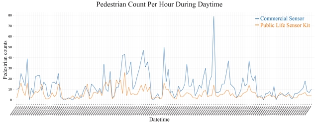 在与Vivacity商业传感器的直接系统对比中,PLSK表现出更高的测量准确性和更丰富的分析维度。在为期三周的日间(7:00-18:00)监测中,PLSK记录的总行人数为864人次,平均每小时6人;而Vivacity传感器则记录了1953人次,平均每小时14人,差异显著。通过分析原始数据并核实现场,研究发现Vivacity传感器反复将场景中一棵静止的树木错误识别为行人,导致了系统性高估。例如,在7月12日正午的一小时内,该传感器的70次检测中有57次为此类误报。这一发现凸显了传统模型在特定复杂场景中应用的局限性,以及现场校准的必要性。相比之下,PLSK不仅提供了更准确的行人计数,更重要的是能输出多维行为标签和地理位置信息,实现了从单纯“计数”到深度“行为解读”的跨越。