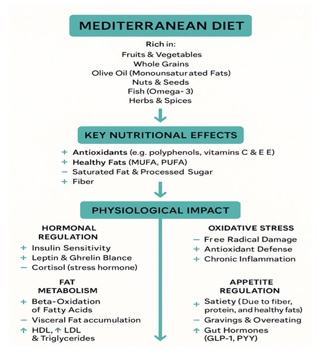 图1总结了地中海饮食对激素调节、氧化应激、脂肪代谢和食欲控制的影响。