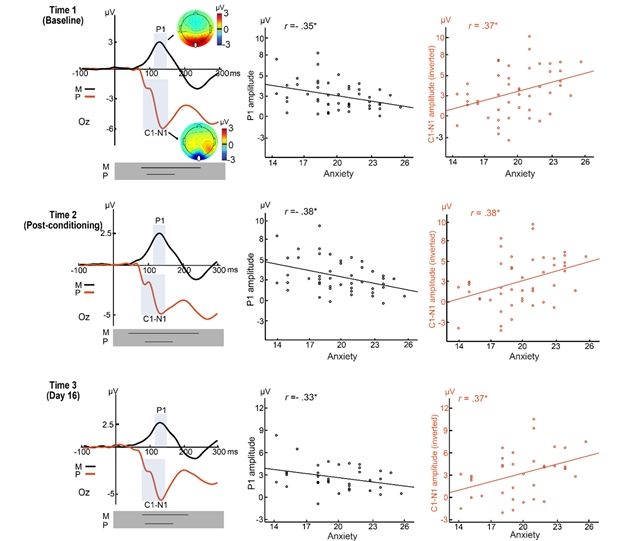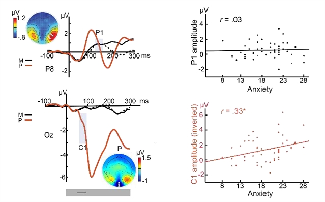 研究发现了一个惊人的现象:主要视觉传导通路(小细胞/P通路)在早期视觉皮层(V1/2区)诱发的C1/N1成分波幅在高特质焦虑个体中显著增强,且与焦虑得分呈显著正相关(三次测试的r值稳定在0.35 ~0.38之间)。更重要的是,这种相关性在16天后的重测中依然稳固(r = 0.37),表明这是一种不随时间消退的稳定"特质烙印"。有趣的是,研究初次发现一条次要视觉传导通路(大细胞/M通路)反应(P1成分)与焦虑呈负相关,这暗示了两条通路间可能存在某种竞争或抑制机制。