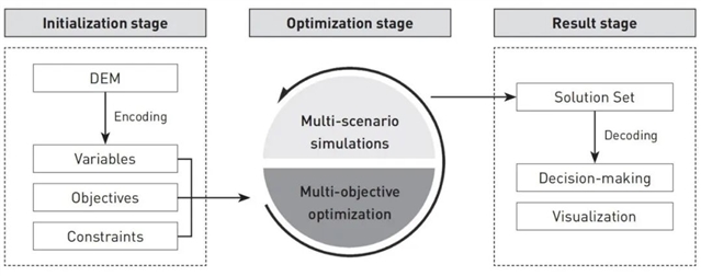 基于DEM多目标优化的生物滞留设施规划布局通过拆解、抽象和提炼地形特征与布局问题中的优化变量、目标和约束条件,构建基于数理逻辑的优化框架。首先,在优化初始化阶段,通过对DEM编码,根据具体优化问题确立优化变量、目标和约束条件。随后,在优化程序阶段,完成求解过程,通过多情景模拟实现不同情景条件下的稳定性测试。最后,在优化结果阶段,解集通过解码得到对应方案,并以可视化形式呈现,辅助最终决策。
