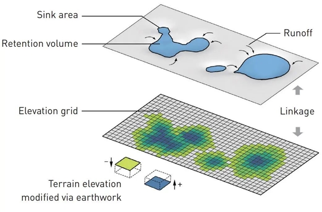 生物滞留设施的形式包括下沉式绿地、生物滞留池、渗沟等。降雨过程中,地表径流沿汇水线流向地势低洼处,并在洼地蓄集后满溢。自然环境中的低洼地带或建成环境中的下凹空间往往是布局生物滞留设施的适宜地点,而如何合理匹配设施是其选址和布局的核心问题之一。本文以设施规模作为切入点,聚焦规模与地形高程变化间的联动关系,从而辅助该类设施的规划布局。