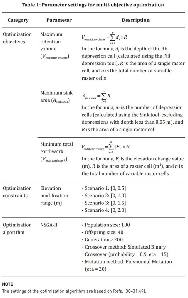 当地政府鼓励借助再生农业与草地修复的天然滞蓄作用,提升农业用地与公共绿地周边的雨水渗蓄与滞留能力。因此,研究将优化目标设定为:1)最大调蓄容积,以增加暴雨期间场地雨水存蓄能力,降低下游地区的洪涝风险;2)最大洼地面积,以增加空间平面上对径流的捕获与滞留能力;3)最小改造土方量,以降低施工成本与环境扰动。