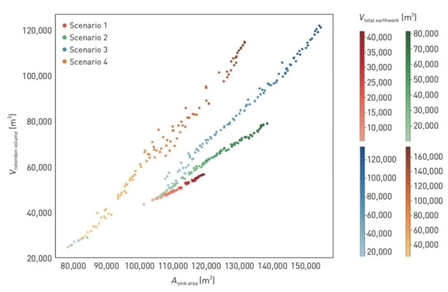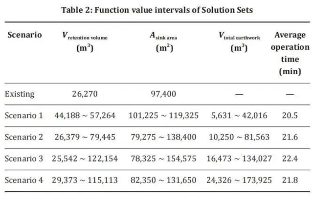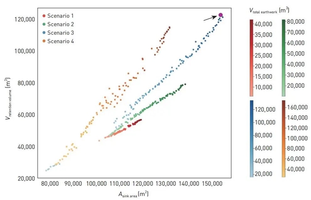最后,本研究选取解集中调蓄容积最大的解进行解码可视化分析。