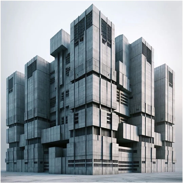 ▲ 图四:由微软 Copilot(基础版)根据提示词“生成一栋丑陋的建筑”所创作的虚拟建筑效果图,呈现出压抑、灰暗、工业化且带有威慑感的视觉特征。这一人工智能实验结果令人警醒——其生成图像竟与部分现实中的获奖建筑存在诸多相似之处。