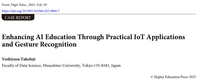 为解决这些问题,日本武藏野大学武藤佳恭(Yoshiyasu Takefuji)教授在Frontiers of Digital Education(《数字教育前沿(英文)》)期刊上发表了一篇题为Enhancing AI Education Through Practical IoT Applications and Gesture Recognition(《通过实用物联网应用和手势识别增强人工智能教育》)的文章,聚焦AI与IoT融合在教育领域的应用痛点与创新解决方案,旨在降低技术门槛,推动更多学习者掌握AI驱动的IoT控制技术。