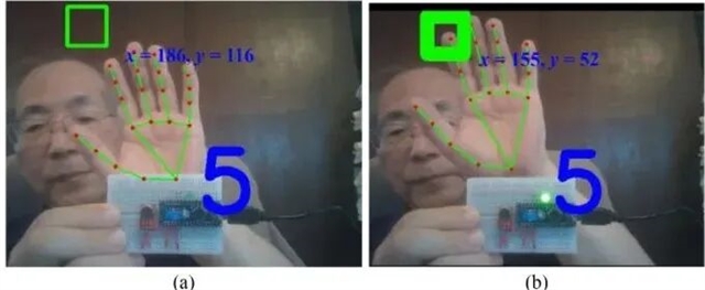 研究提出以Python的Firmata协议和AI库MediaPipe为核心的技术方案。Firmata协议实现了主机与微控制器的无缝通信,开发者无需修改IoT设备固件,仅通过更新主机端Python程序即可实现设备功能升级,彻底规避了传统固件更新的复杂流程,同时省去了对C++编程的依赖。MediaPipe则凭借预训练模型优势,将复杂的手势识别任务抽象为简单的二维坐标处理——其能自动生成21个手部特征点的(x,y)坐标,开发者无需进行大规模数据训练或复杂计算,即可基于这些坐标实现对IoT设备的实时控制,例如通过识别食指指尖是否处于预设虚拟区域来控制 LED 灯开关,或根据食指水平坐标调节伺服电机角度。