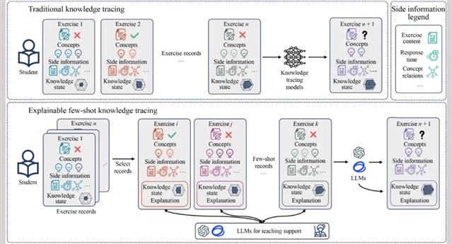 传统知识追踪虽借助深度学习取得进展,但与真实教学场景存在差距。一方面,传统方法依赖大量学生练习数据训练模型,而实际中教师仅通过少量练习就能分析学生知识掌握情况;另一方面,传统模型多仅预测学生答题正确性,呈“黑箱”特性,无法像教师那样解释推理过程,且难以整合学习环境中的多维信息,在开放式答题、编程学习等场景适应性不足。