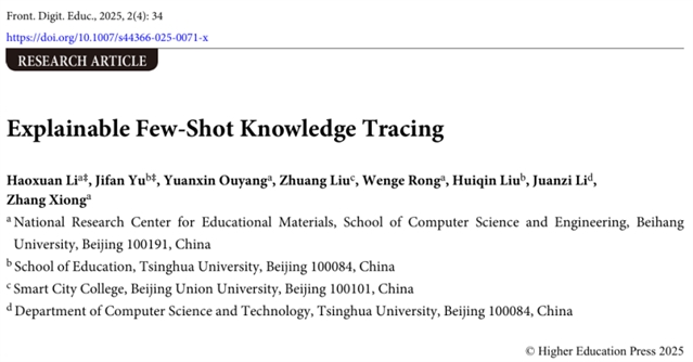 为填补这些空白,北京航空航天大学熊璋教授团队联合清华大学李娟子教授团队,在Frontiers of Digital Education(《数字教育前沿(英文)》)期刊上发表了一篇题为Explainable Few-Shot Knowledge Tracing(《可解释的少样本知识追踪》)的文章,提出可解释少样本知识追踪新范式并构建认知引导框架,为教育评估提供更贴合实际教学场景的解决方案。