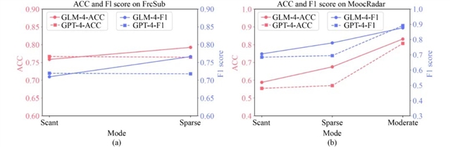 图3 GLM-4 与 GPT-4 在 (a) FrcSub 和 (b) MoocRadar 上的表现