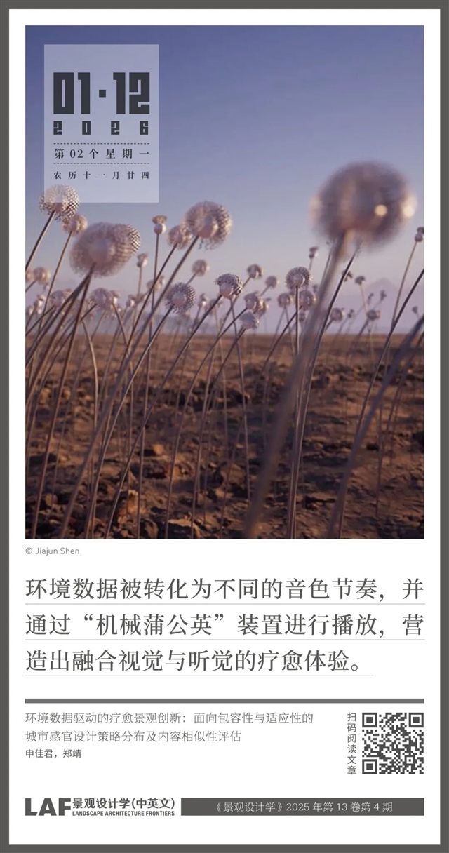 本文探讨了在技术驱动的社会中,如何通过感官设计创新构建具有疗愈功能的包容性与适应性城市环境。研究以莫里斯·梅洛-庞蒂(Maurice Merleau-Ponty)的知觉现象学及人类学“感官转向”(sensory turn)理论为基础,批判技术资本扩张导致的城市发展失衡与感官异化,并提出以身体感知作为连接人与环境的核心。文章通过“风之归宿”“盲人花园”和“荒野之息”三个实践项目,展示了将实时气候数据、城市色彩信息及荒野环境参数,经由创造性算法转化为多感官(尤其是听觉)景观体验的设计方法。这些实践旨在通过数据转译增强公众的环境感知与反思,为特定群体(如视障者)提供包容性设计解决方案,并探索了数字智能在景观设计中创造动态、交互式疗愈空间的潜力与局限。