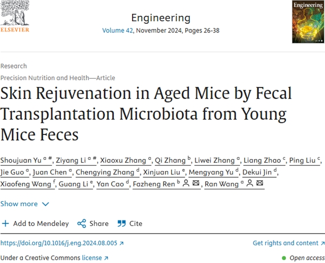 Shoujuan Yu, Ziyang Li, Xiaoxu Zhang, Qi Zhang, Liwei Zhang, Liang Zhao, Ping Liu, Jie Guo, Juan Chen, Chengying Zhang, Xinjuan Liu, Mengyang Yu, Dekui Jin, Xiaofeng Wang, Guang Li, Yan Cao, Fazheng Ren, Ran Wang. Skin Rejuvenation in Aged Mice by Fecal Transplantation Microbiota from Young Mice Feces. Engineering, 2024, 42(11): 29-42 DOI:10.1016/j.eng.2024.08.005