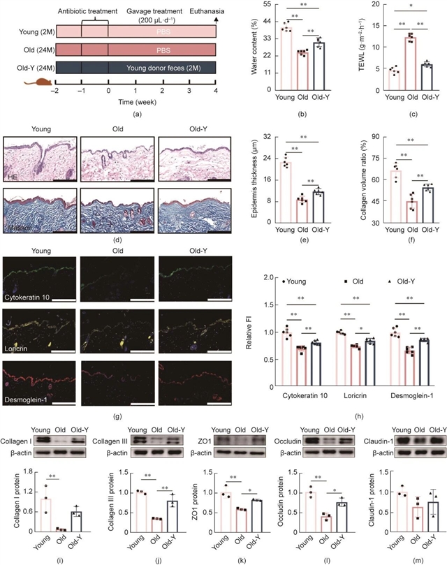 图1 将年轻小鼠的粪便微生物群移植到老年小鼠体内可改善皮肤屏障功能。