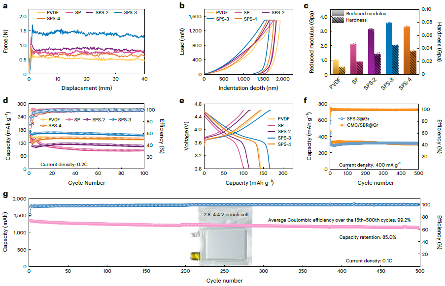 优异的电化学性能是粘结剂实际应用的前提。180°剥离测试与纳米压痕结果表明,粘结剂显著提升了NCM111电极的机械稳定性。半电池在循环100次后容量保持率达89.3%。进一步的透射电镜分析显示,粘结剂可在活性物质颗粒表面形成均匀致密的保护层,有效抑制界面副反应。同时,硫酸的引入缓解了水系加工条件下铝集流体的腐蚀问题。组装的1.3-Ah NCM111//石墨软包电池在0.1 C倍率下循环500次后容量保持率达85.0%,平均库仑效率超过99.9%,能量密度达到191.0 Wh kg-1,充分展现了该粘结剂在实际应用条件下的长期稳定性与高可靠性。
