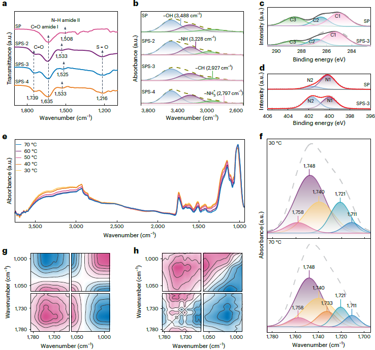 该工作通过将天然丝胶蛋白与硫酸进行交联,构建了一种水系粘结剂。通过红外光谱与X射线光电子能谱证实了双交联网络的氢键与离子相互作用,该网络结构使得粘结剂具有优异的机械强度。变温红外与二维相关光谱分析动态解析出各基团随温度解离的先后顺序,同时证明粘结剂中氢键和离子相互作用随着温度的升高而减弱,从分子层面阐明了粘结剂在热水中快速解离的机理,为电极的直接回收提供可行性。