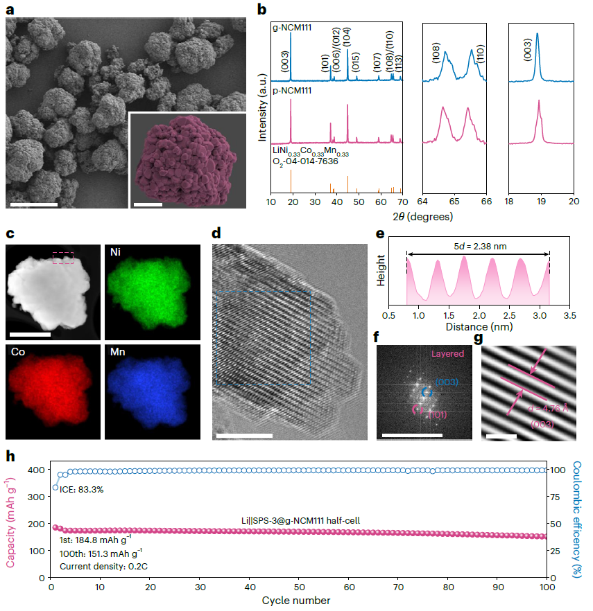 得益于粘结剂的独特可逆解离特性,该研究构建了一条极为简洁且绿色的直接回收路径。退役电池拆解后,其正/负极片仅需在60 ℃水中浸泡<1min,活性物质层即可从集流体上完全、洁净地剥离,全过程无需任何有机溶剂。回收的铝箔光洁无腐蚀,可直接回用,显著降低了回收成本与环境负担。对剥离获得的废旧NCM111材料进行补锂再生后,X射线衍射和高分辨透射电子显微镜表征结果表明,再生材料的晶体结构与颗粒形貌均恢复至接近原始状态。电化学测试显示,再生NCM111的首圈放电容量达到184.8 mAh g-1,循环100次后的容量保持率与新材料基本一致,实现了性能的有效恢复,充分验证了该直接回收策略的可行性与高效性。
