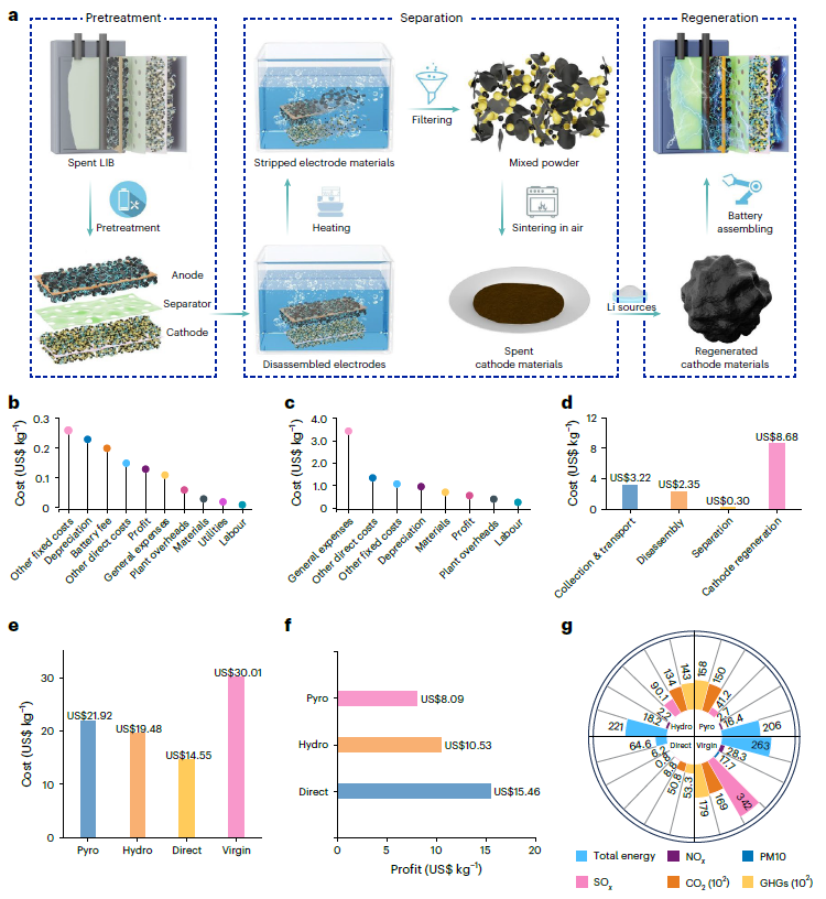 为量化该回收策略的工业化潜力,研究团队基于美国阿贡国家实验室开发的EverBatt模型进行了技术经济分析。结果显示,本直接回收路线生产1 kg再生NCM111材料的成本仅为$14.55,显著低于传统火法冶金($21.92)和湿法冶金($19.48)工艺,对应的净利润可达$15.46。在环境效益方面,该工艺的温室气体排放量与总能耗较传统回收方法降低约60%–70%,展现出显著的节能减排优势。综合来看,该策略不仅具备突出的经济竞争力,同时兼顾环境友好性,为推动锂离子电池回收向绿色、低碳与规模化方向发展提供了一条极具潜力的可持续路径。