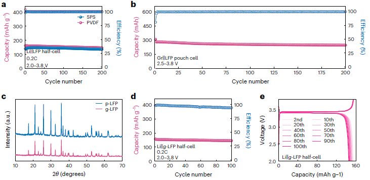 为验证该策略的广泛适用性,研究进一步将其拓展至两类主流正极材料体系——橄榄石结构的磷酸铁锂(LFP)和尖晶石结构的高电压镍锰酸锂(LNMO)。电化学测试结果表明,粘结剂与这两种正极材料均具有良好的兼容性。LFP正极半电池中循环200次后容量保持率达到90%,与传统PVDF粘结剂体系相当,对应的软包全电池同样展现出稳定的长循环性能。更为重要的是,基于该粘结剂构建的同一直接回收流程对LFP和LNMO电极同样适用:极片经热水处理即可实现活性物质的完整、无损剥离,随后通过相应再生工艺恢复性能。再生后的LFP材料保持完整晶体结构,在半电池中循环100次后容量保持率高达92.4%,充分证明该策略在不同正极化学体系中的优异通用性与广泛应用潜力。