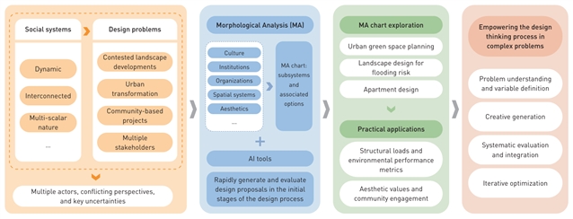 在城市规划、景观与建筑设计领域,设计师和规划师常面临复杂且多维的社会议题。为有效应对这些挑战,本研究引入形态分析方法,系统探索并辅助生成多样化的社会设计方案。形态分析可构建“子系统–选项”矩阵,同时兼顾定量因素与定性因素,让设计师能够在项目早期阶段,运用该方法评估问题的确定性或不确定性。本研究进一步将形态分析与人工智能生成内容进行深度融合以迅速生成及评估多样化的设计提案,提升设计流程的创新效能与实用价值。基于本文所提出的社会未来形貌构建框架,设计师能够从多种视角审视设计问题,发现更多元的解决方案,并依托系统化的评估工具对设计方案进行有效评估。由此,可保持设计过程的动态适应性,进而实现设计策略的持续优化与迭代升级。本研究丰富了设计理论体系,也为相关设计实践提供了实用工具与指导。