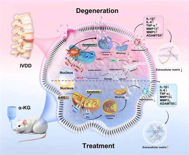 该研究首次系统阐明了从METTL3介导的m6A修饰,经MALAT1/miR-23c/IDH1信号轴,调控α-KG依赖性线粒体自噬与细胞凋亡的分子通路,不仅深化了对椎间盘退变机制的理解,也为未来开发以α-KG或其上游调控因子为靶点的干预策略提供了理论依据和实验基础。在人口老龄化加剧的今天,该研究为推动IVDD的代谢干预治疗迈出了关键一步,也为其他与衰老相关的退行性疾病的防治提供了新思路。