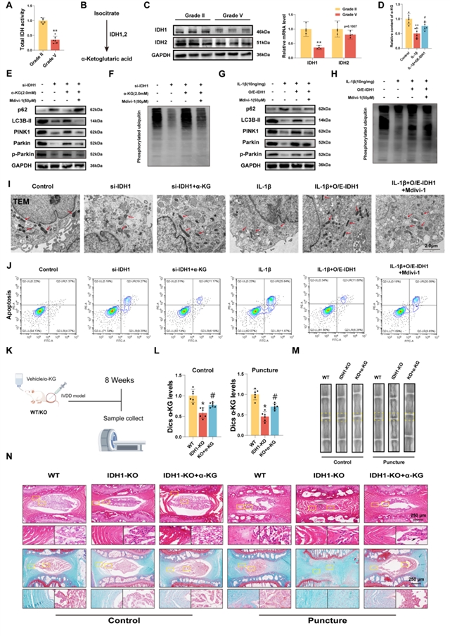 α-KG从何而来?研究将目光投向三羧酸循环中的关键酶——异柠檬酸脱氢酶(IDH)。发现IDH1在退变髓核组织中表达显著降低,且其酶活性下降。在细胞中敲低IDH1会减少α-KG生成,并重现线粒体自噬抑制、ROS积累和凋亡增加的表型;而过表达IDH1则能逆转IL-1β的损伤。IDH1基因敲除小鼠更易发生椎间盘退变,且对α-KG治疗敏感,确立了IDH1在代谢供应端的核心地位。α-KG从何而来?研究将目光投向三羧酸循环中的关键酶——异柠檬酸脱氢酶(IDH)。发现IDH1在退变髓核组织中表达显著降低,且其酶活性下降。在细胞中敲低IDH1会减少α-KG生成,并重现线粒体自噬抑制、ROS积累和凋亡增加的表型;而过表达IDH1则能逆转IL-1β的损伤。IDH1基因敲除小鼠更易发生椎间盘退变,且对α-KG治疗敏感,确立了IDH1在代谢供应端的核心地位。