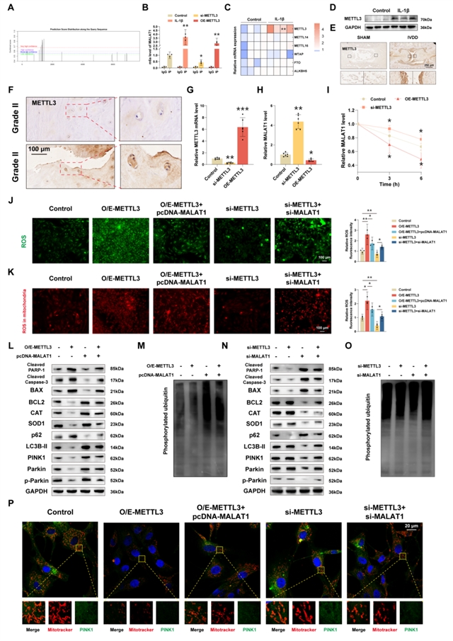 什么控制了“海绵”MALAT1的丰度?研究表明,在退变环境中,RNA m6A甲基转移酶METTL3表达上调。METTL3在MALAT1转录本上催化形成m6A修饰,此修饰导致MALAT1 RNA稳定性下降、加速降解。过表达METTL3会降低MALAT1水平,进而引发miR-23c上升、IDH1下降的连锁反应,最终抑制线粒体自噬;敲低METTL3则产生相反效果。这揭示了疾病中MALAT1下调的表观转录组学根源。