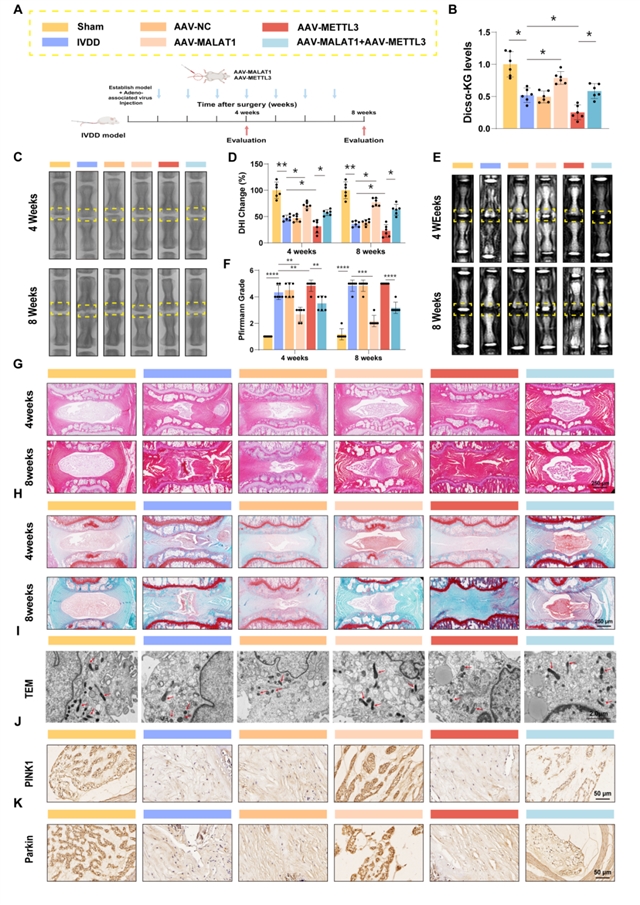 最后,研究在动物模型中进行功能挽救实验。向退变椎间盘内注射过表达MALAT1的病毒,能有效提升局部α-KG水平、增强线粒体自噬,并显著延缓椎间盘结构破坏。然而,若同时过表达METTL3,则会抵消MALAT1的治疗获益。这从整体动物水平验证了 “METTL3 ↑ → m6A-MALAT1 ↓ → miR-23c ↑ → IDH1 ↓ → α-KG ↓ → 线粒体自噬抑制 → 椎间盘退变” 这一全新调控轴的存在及其病理重要性。