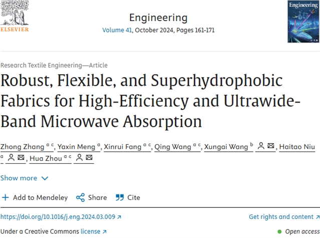 在当今数字化时代,无线通信设备、大功率信号发射器和家用网络电子设备的广泛应用,使得电磁辐射问题日益凸显。电磁辐射不仅会对人体健康产生潜在威胁,还可能对电子设备的正常运行造成干扰。因此,开发高性能微波吸收材料以有效防护电磁辐射,成为当前科学研究的重要方向。青岛大学与香港理工大学联合团队在中国工程院院刊《Engineering》发表题为“Robust, Flexible, and Superhydrophobic Fabrics for High-Efficiency and Ultrawide-Band Microwave Absorption”的研究成果。该研究成功研发出一种兼具高性能、柔性与超疏水特性的新型织物,其具备高效超宽带微波吸收能力,为电磁防护材料的创新研发提供了全新思路。论文第一作者为张仲,王训该、牛海涛、周华共同担任通讯作者。