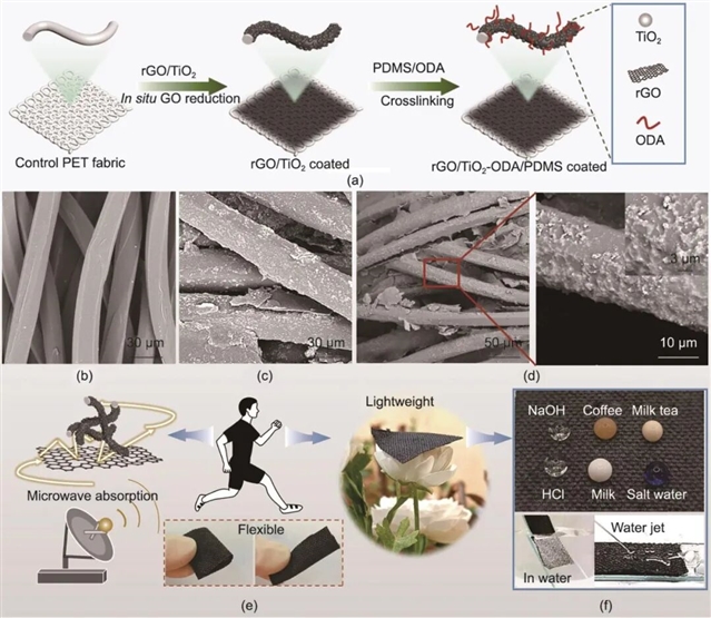 研究团队采用一种简单的浸涂方法,成功开发出这种具有超疏水表面特征的微波吸收织物。该方法的核心在于通过原位还原氧化石墨烯(GO),并在聚酯织物上沉积二氧化钛(TiO2)纳米粒子,随后涂覆聚二甲基硅氧烷(PDMS)和十八胺(ODA)的混合物。这种独特的涂层结构赋予了织物优异的超疏水性,其水接触角达到159°,滑动角仅为5°。更为重要的是,在传导损耗、极化损耗和异质形貌的协同作用下,该织物展现出卓越的微波吸收性能。当还原氧化石墨烯(rGO)的负载量为6.9 wt%时,织物的最小反射损耗(RLmin)可达−47.4 dB,最大有效吸收带宽(EABmax)达到7.7 GHz。