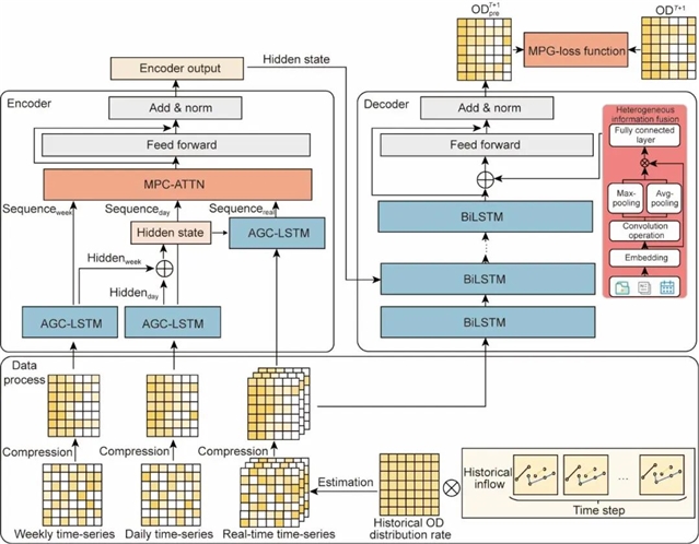在模型架构方面,PAG-STAN采用了编码器-解码器框架。编码器部分引入了自适应图卷积长短期记忆网络(AGC-LSTM)和多周期交叉注意力机制(MPC-ATTN),用于学习OD需求的周期性时空分布信息。解码器部分则使用多个双向长短期记忆网络(BiLSTM)来建模上下文信息,并解码OD需求的全局分布特征。此外,模型还引入了异构信息融合模块(HIFB),结合相关数据、日期属性数据等,全面挖掘突发公共卫生事件期间外部因素对OD需求的影响。