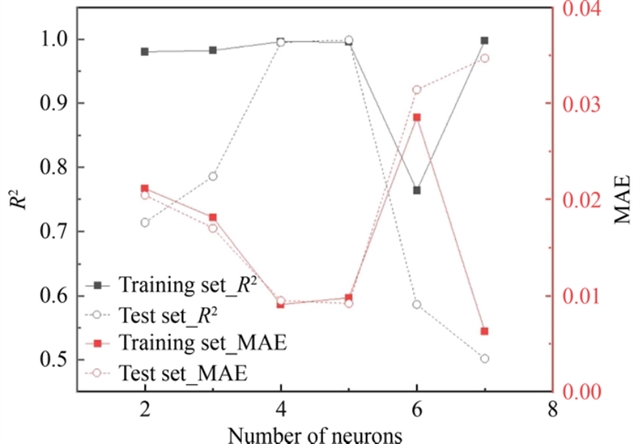 图3 决定系数(R2)与平均绝对误差(MAE)随隐藏层神经元数量的变化