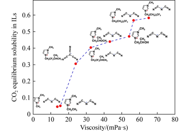 图4 表征离子液体粘度与CO2平衡溶解度权衡关系的帕累托最优曲线
