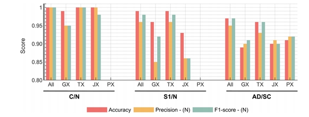 通过将转录组数据导入人体代谢模型(Recon3D),生成患者特异性代谢流量分布,并结合基因组、蛋白质组数据,构建高精度多组学分类器。如图2所示, 在肺癌分类任务中,多组学整合模型(All)在癌 vs 正常(C/N) 和早期 vs 正常(S1/N) 分类中均达到接近完美的准确率(>95%),显著优于任何单一组学模型。该结果表明了整合不同数据层的必要性。