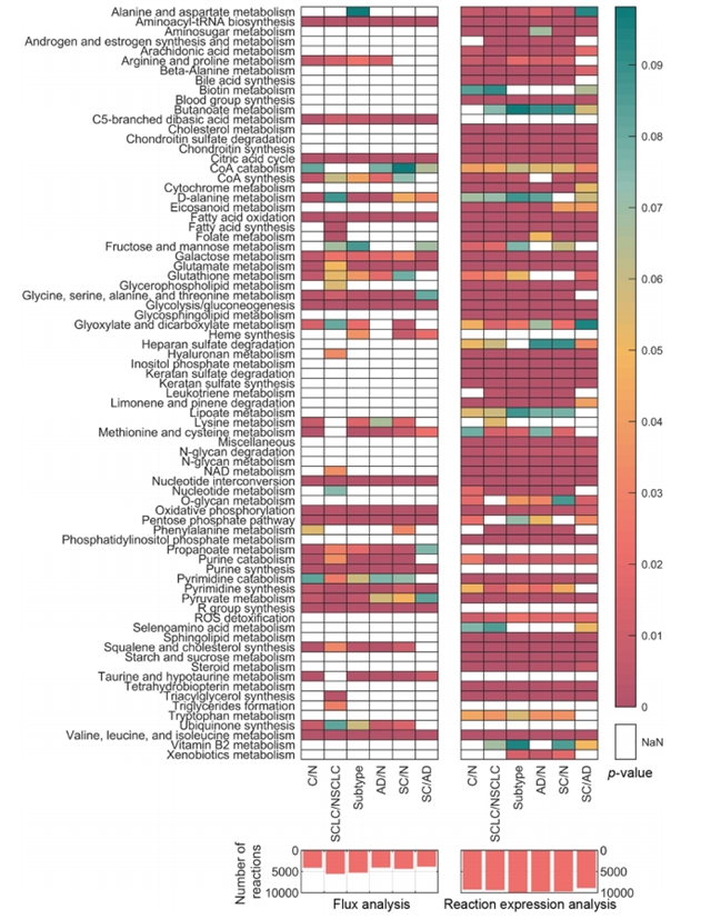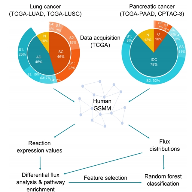 研究团队首先将肺癌患者的转录组数据整合至人体基因组尺度代谢模型中,生成样本特异性的代谢流分布。随后,将这些代谢流数据与基因组、蛋白质组数据结合,构建多组学分类器。利用随机森林等机器学习方法及SHAP值分析,在肺癌中成功识别出与癌症状态、亚型及早期阶段相关的关键代谢通路(如脂质代谢、糖酵解)和生物标志物。该整合模型在区分癌组织与正常组织、肺癌亚型及早期阶段的任务中均表现出优异性能。此外,该流程在样本量有限的胰腺癌数据中同样验证有效,证明了其强大的稳健性与泛化能力。